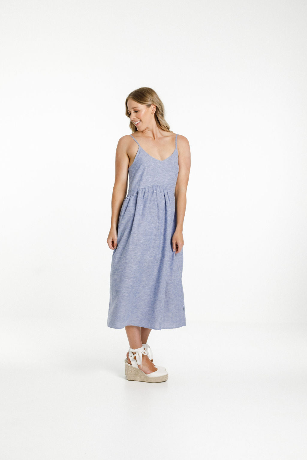Made from a soft Cotton/Linen blend and featuring a V neck with thin straps. This mid-weight Cotton/Linen does not have stretch in the fabric, so includes a hidden zip on the side of the bodice.