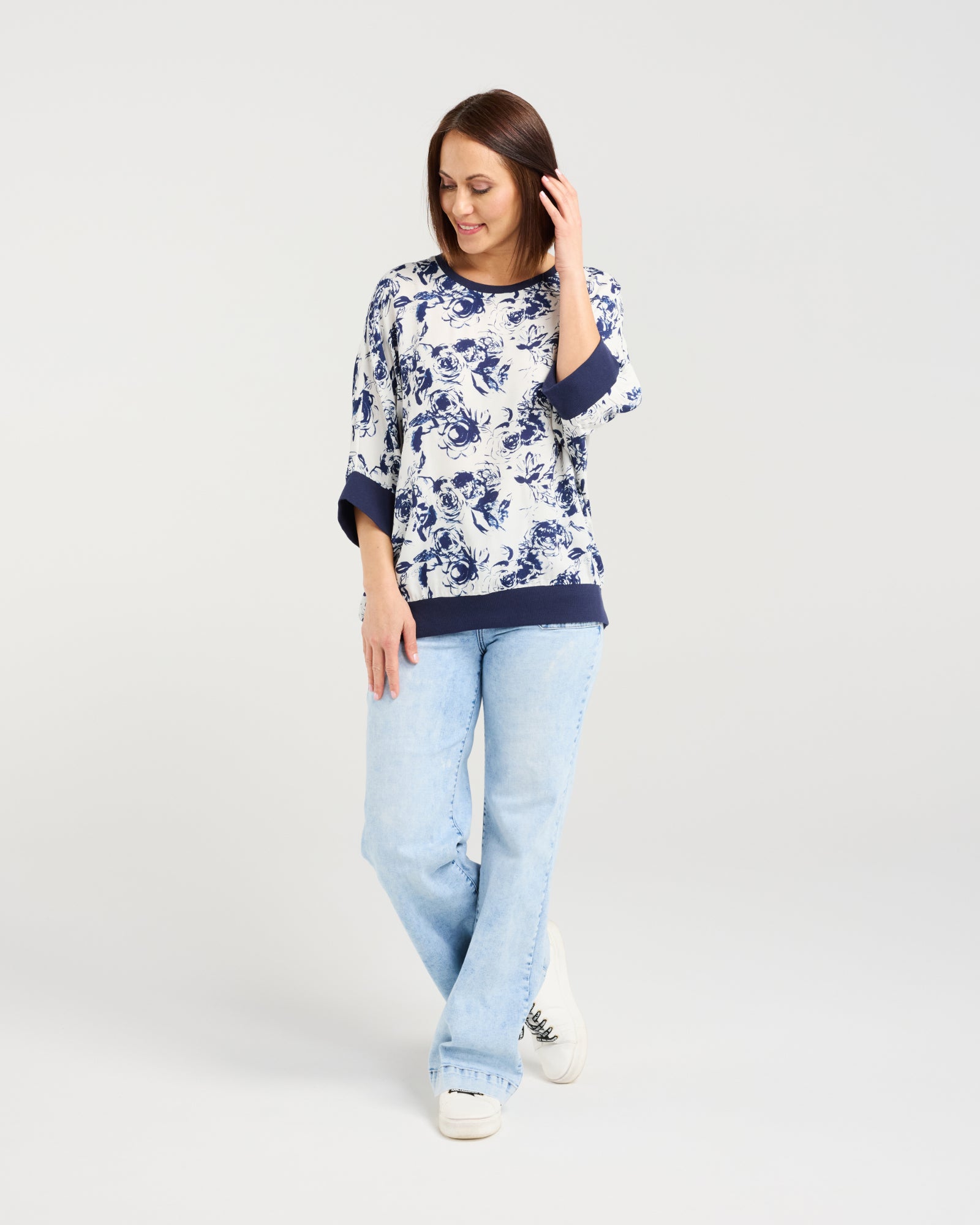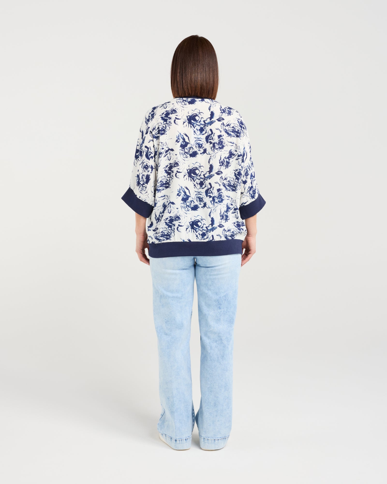 This relaxed-fit top features below-elbow sleeves finished with wide blue elasticated cuffs and a matching hem for a polished, comfortable fit. Crafted in a fresh blue and white floral fabric, it brings a light, cheerful touch to winter layering while keeping an effortless silhouette.